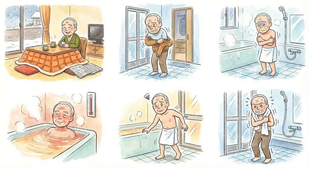 ヒートショックは特に外気温の低い冬の入浴前後に起きやすいことがわかっています。暖かいリビングから寒い浴室へ移動し、熱いお風呂入って上がりまでヒートショックになりやすい状況を示します。